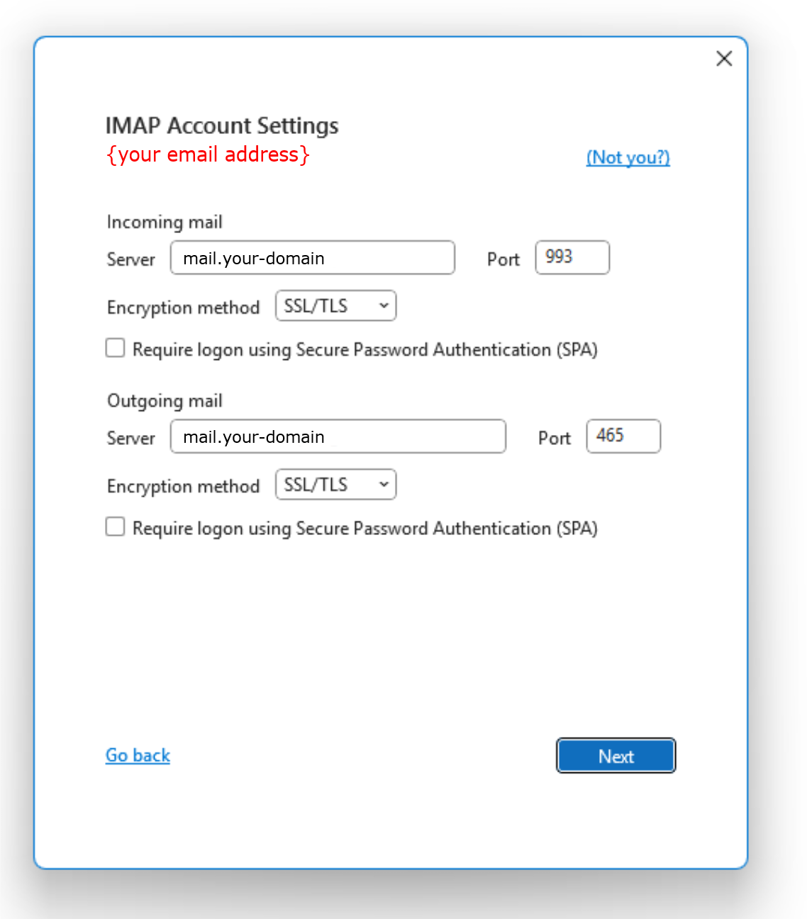Note: You will have to replace mail.your-domain * in the 2 server fields.