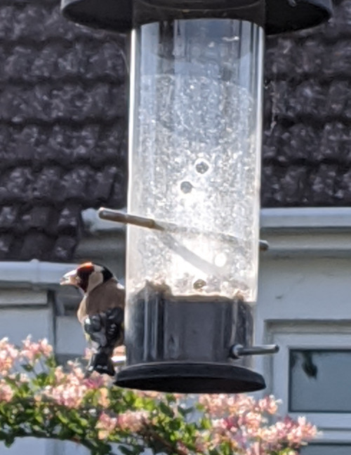 My other project is an annual attempt to get a good picture of the goldfinches. I have a zoom lens attached to the phone and pointed at an object such as a TV aerial. Of course, they never land on the thing I have focused on. This image was taken without the zoom as one landed on the bird feeder near where I was sat.