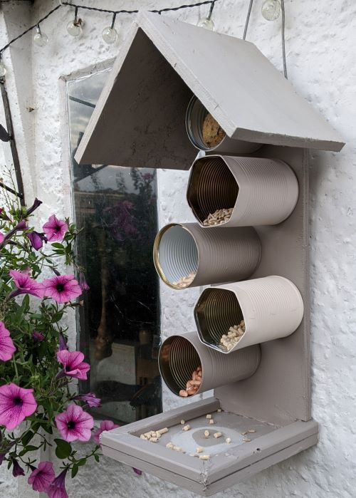 I sprained my ankle before then Bank Holiday weekend. The long walk we planned was postponed, and we tidied the garage instead. We also made a bird feeder out of old tin cans and scraps of wood (from the garage clear-out). I think we are rather proud of it!